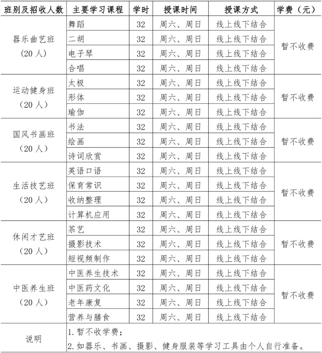 结合龙井市老年群体特点,计划开设器乐曲艺、运动健身、国风书画、生活技艺、休闲才艺、中医养生6个兴趣专业班,各班开设课程3-4门,每班计划招生20人(按报名时间先后顺序和现场确认情况定额),额满即止,如招生人数不到10人则不开班。具体开课计划见下表: