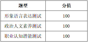 考生面试主要由形象语言表达测试、政治人文素养测试、职业认知潜能测试三项内容组成,每项测试100分,总分300分。