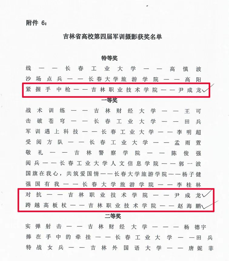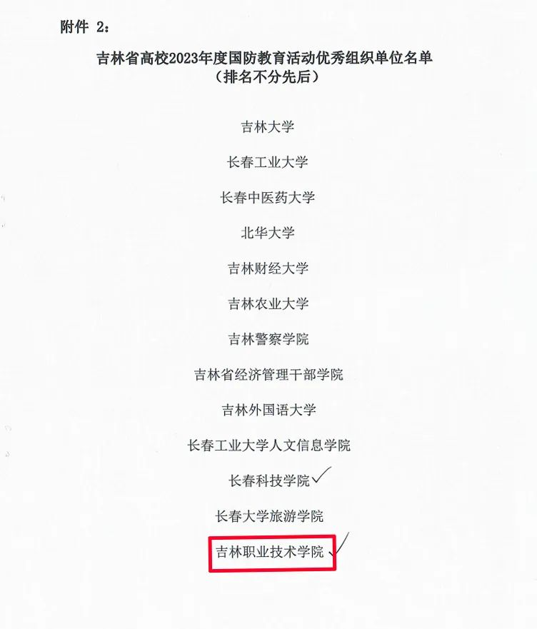(记者 杨晓明)近日,2023年度吉林省普通高等学校国防教育工作先进单位和先进个人评选活动结果公布,我校荣获吉林省高校2023年度国防教育活动优秀组织单位,段世娇、李泓辉获得吉林省高校第四届国防教育科研论文二等奖。尹成龙获得吉林省高校第四届军训摄影特等奖,赵海鹏获得吉林省高校第四届军训摄影特等奖。