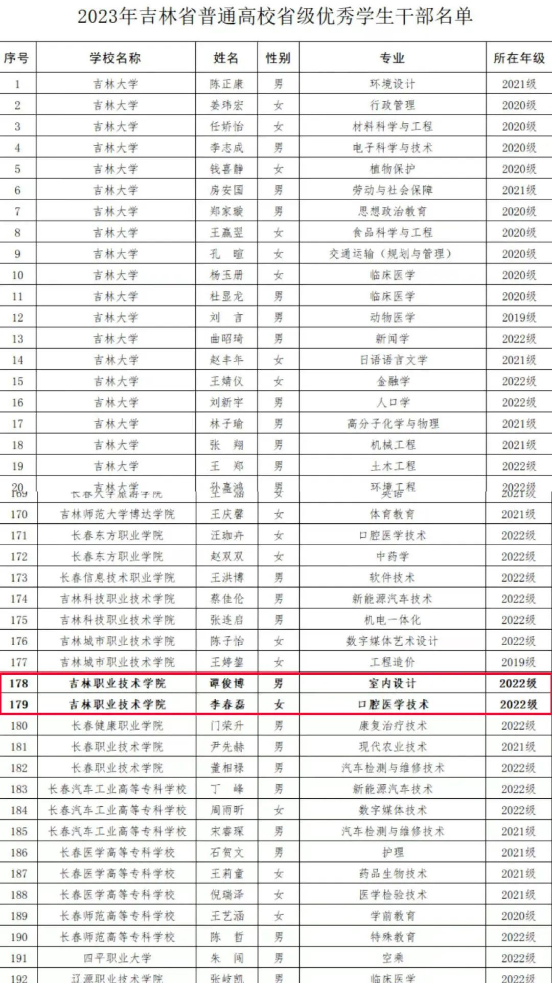 (记者 杨晓明)近期,吉林省教育厅发布《关于公布2023年吉林省普通高校省级优秀大学生(标兵)、优秀学生干部(标兵)和先进班集体名单的通知》,我校电气自动化专业王俊皓等7名同学获评“吉林省优秀大学生”,口腔医学技术专业李春磊等2名同学获评“吉林省优秀学生干部”,2022级运动训练1班等2个班级获评“吉林省先进班集体”。