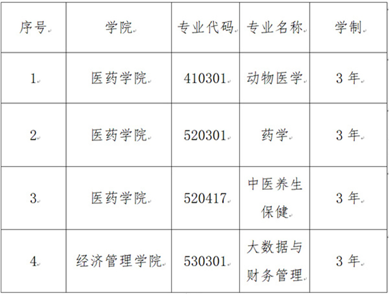 根据《教育部关于公布2022年高等职业教育专科专业设置备案和审批结果的通知》(教职成函〔2022〕1号)安排,2022年我校新增4个专业。