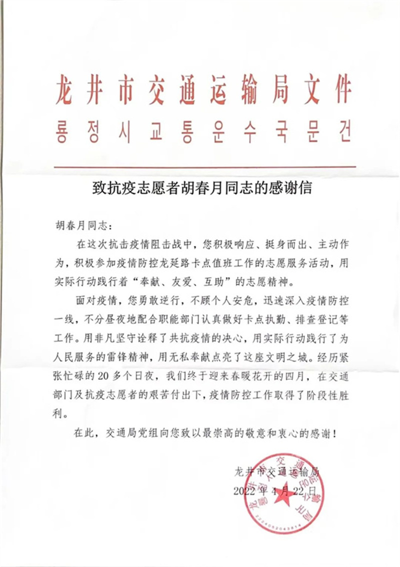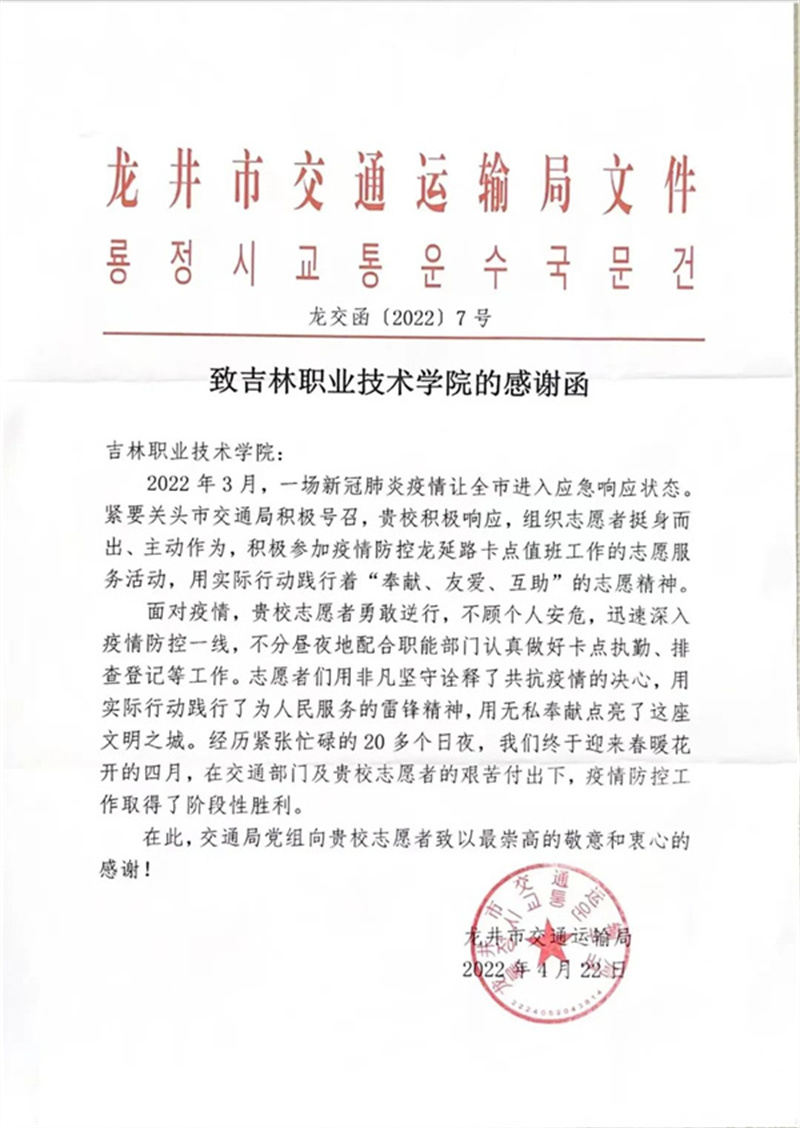 近日,龙井市交通运输局向国产高清在线精品一区二区三区发来感谢信,对学校在疫情防控工作中给予的大力支持表示感谢,对教师志愿者表示敬意。