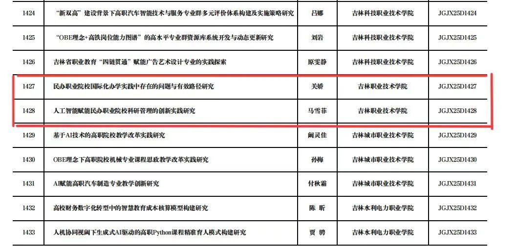 (通讯员 马雪菲)近日,吉林省高等教育学会发布了《关于公布2025年度吉林省高教科研课题立项通知》(吉高学会〔2025〕6号),经过省高教学会专家组三轮评审,确定了2025年吉林省高教科研课题立项名单,我校获批立项课题2项!