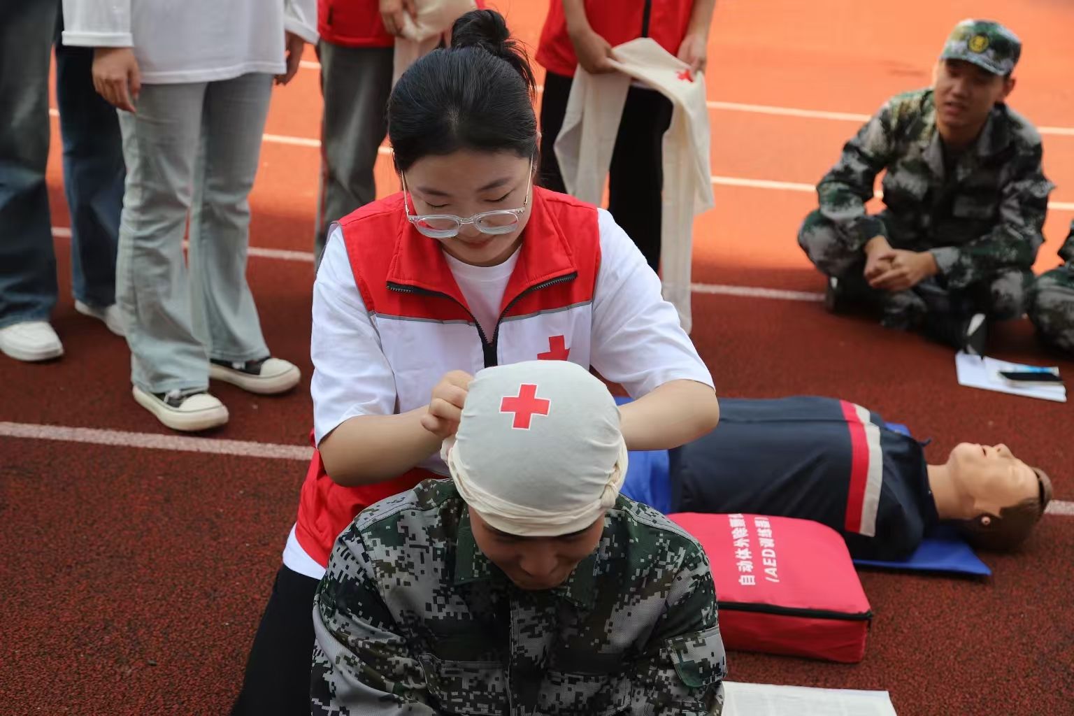 (通讯员 张巍)9月9日,在第26个世界急救日来临之际,我校红十字会以“军训护航·急救同行”为主题,在学校操场为2025级军训新生带来了一场生动、实用、意义深远的急救知识技能普及活动。活动旨在切实保障新生军训期间的人身安全,提升新生应对军训常见意外的自救互救能力,将急救教育融入新生入学适应的关键时期,为平安军训筑牢安全防线,同时传递“人人学急救,急救为人人”的红十字理念。