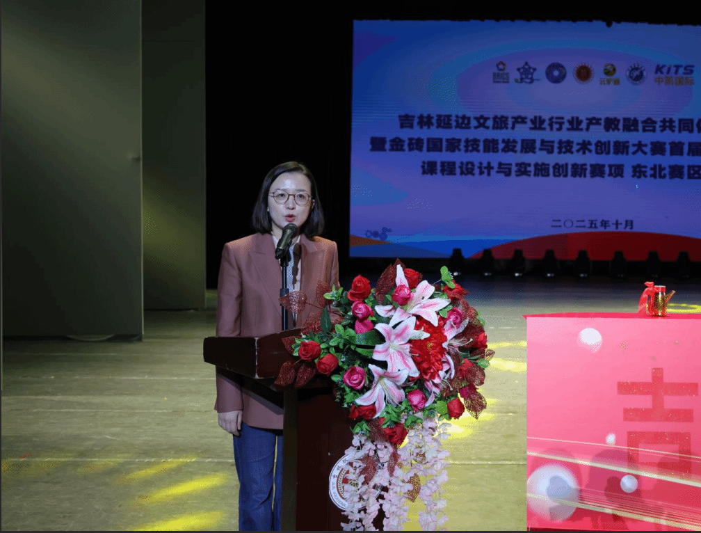 在全场热烈的掌声与激昂的音乐中,延边州文化广播电视和旅游局副局长金炫青高声宣布:“2025一带一路暨金砖国家技能发展与技术创新大赛首届国际研学旅行课程设计与实施创新赛项东北赛区正式开幕!”现场掌声雷动,参会人员共同为赛事开启送上热烈祝福。